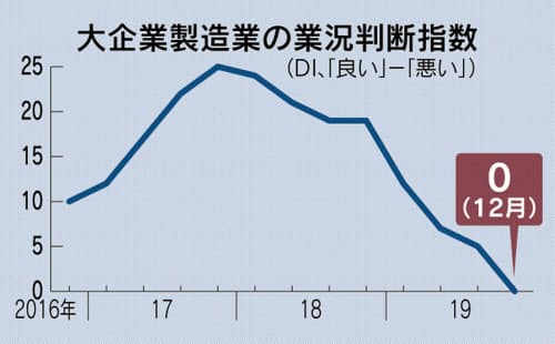 日銀が13日発表した12月の全国企業短期経済観測調査(短観)で、大企業製造業の景況感を示す業況判断指数(DI)はゼロとなり、9月の前回調査から5ポイント悪化した。4四半期連続の悪化となる。米中貿易戦争で外需の低迷が続いたほか、台風19号による工場の操業停止も影響した。大企業非製造業も消費増税で個人消費が低迷し、2期連続で悪化したが、小幅の悪化にとどまった。