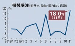 11月の機械受注、前月比18.0%増 市場予想3.3%増 - 日本経済新聞