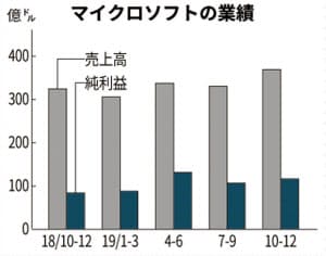 クラウド以外の事業では、パソコンメーカーに納めるOS「ウィンドウズ」の販売額が前年同期比で18%増えた。この期は、20年1月の「ウィンドウズ7」のサポート終了の直前にあたり、世界的に「10」への更新需要が拡大した。新製品を投入したパソコン「サーフェス」の売上高は6%増えた一方で、20年に新型「Xbox」の発売を控えるゲーム事業は21%の大幅減となった。