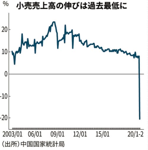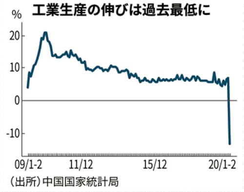 1~2月の工業生産は前年同期比13.5%減だった。伸び率はリーマン・ショック直後の09年1~2月(3.8%増)を下回り、過去最低を更新した。防疫活動で原材料や部品の輸送が止まり、従業員も出勤できず、多くの工場が操業を停止した。自動車、パソコンなど主な製品の生産量は軒並み、前年同期の水準を下回った。