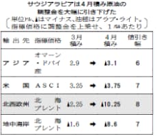 サウジの代表的な油種、アラブ・ライトの場合、日本などアジア向けの3月積みの調整金は、指標となるオマーン産とドバイ産のスポット価格の平均値プラス2.9ドルという高めの設定だった。ところが、4月積みは、マイナス3.1ドルに設定された。前月比の値引き幅は6ドルだ。
