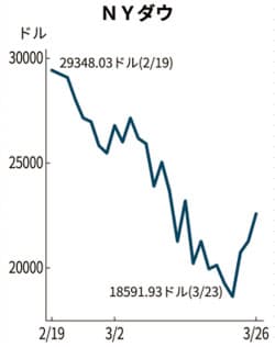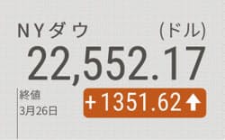 【ニューヨーク=野村優子】26日の米国株式市場でダウ工業株30種平均は3日続伸し、終値は前日比1351ドル高の2万2552ドルだった。3日間の上昇幅は4000ドルに迫り、2週間ぶりに2万2000ドルを回復。米上院が25日、新型コロナウイルスに対応する2兆ドル(約220兆円)規模の経済対策法案を可決し、早期に景気刺激策が実施されるとの期待が高まった。