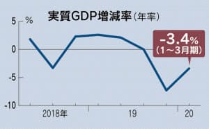 新型コロナ:1~3月実質GDP、年率3.4%減 2期連続マイナス - 日本経済新聞