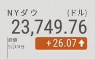 【NQNニューヨーク=古江敦子】4日の米株式市場でダウ工業株30種平均は3営業日ぶりに小反発し、前週末比26ドル07セント(0.1%)高の2万3749ドル76セントで終えた。新型コロナウイルスの感染源を巡り米中の対立が激化するとの警戒感から売りが先行した。売り一巡後は石油株やハイテク株を中心に買いが強まり、引けにかけて上げに転じた。