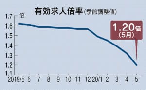 有効求人倍率は仕事を探す人1人に対し、企業から何件の求人があるかを示す。1.20倍の倍率は15年7月以来、4年10月ぶりの低い水準だ。5月は有効求人が前月から8.6%減り、有効求職者は0.7%増えた。