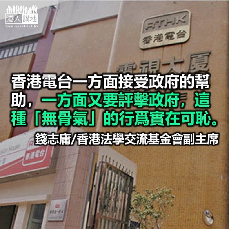而且,香港電台一直以來深受政府資助,本應以支持政府的姿態製作節目。現在,香港電台一方面又要接受政府的幫助,一方面又要評擊政府。筆者認為這種「無骨氣」的行爲實在可恥。香港電台不分青紅皂白地批評政府,掀起了一場反政府的政治鬥爭。這種盲目的抨擊行為令筆者有理由相信,香港電台已經被外國勢力壟斷了 。