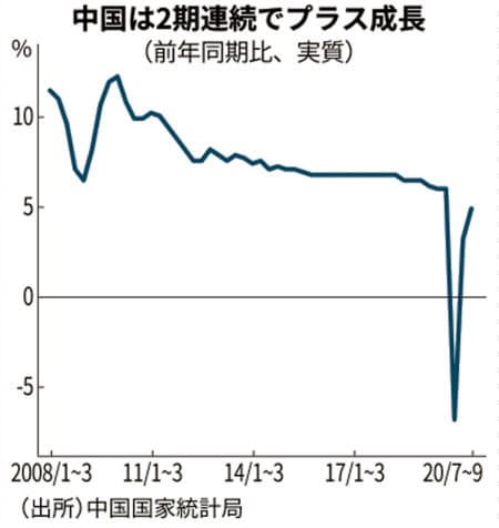 中国経済は新型コロナウイルスが直撃した20年1~3月、1992年に公表を始めた四半期ベースでは初のマイナス成長に沈んだ。その後、ウイルスを抑えこんで生産が回復し、4~6月はプラス成長に戻った。