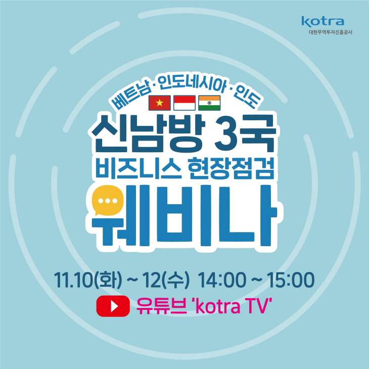 신남방 3국 비즈니스 현장점검 웹세미나는 베트남, 인도네시아, 인도 순으로 사흘간 진행되며 유튜브채널 ‘KOTRA TV’에서 시청할 수 있다.