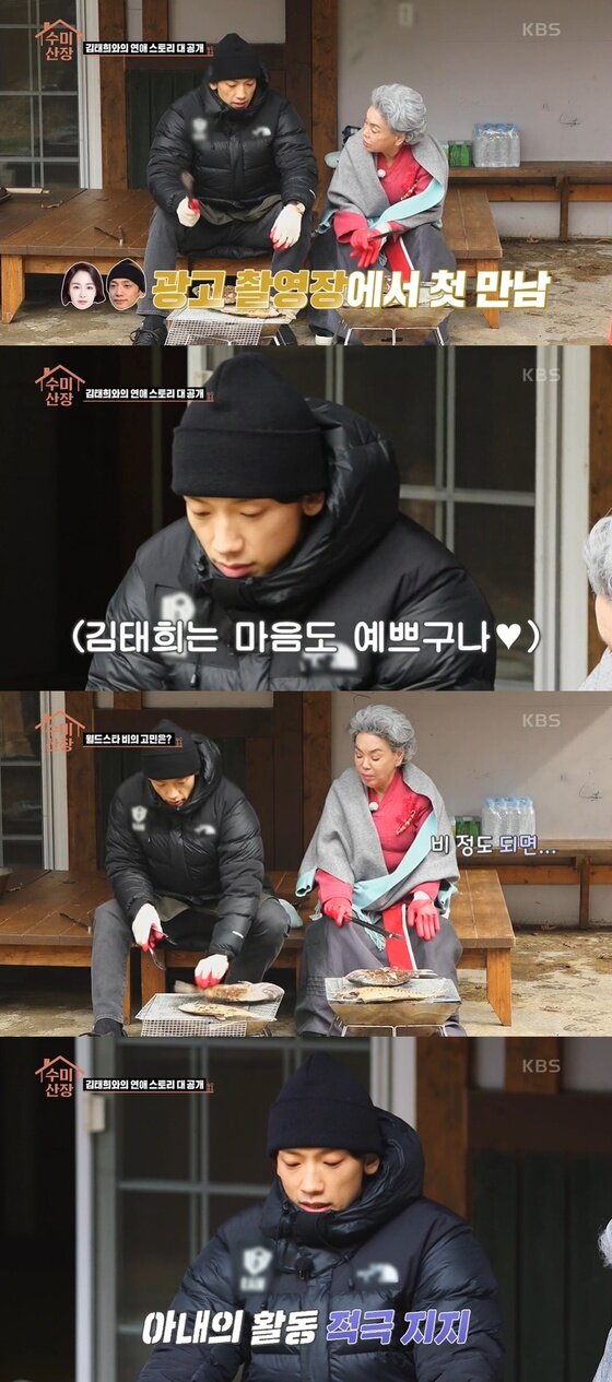 이날 김수미는 비와 숯불 생선구이를 만들다가 "김태희씨와는 어떻게 만나게 됐냐"라고 물었고, 비는 "광고 현장에서 봤다"라며 "광고를 둘이 같이 찍었는데 당연히 너무 예뻤다"라고 답했다.