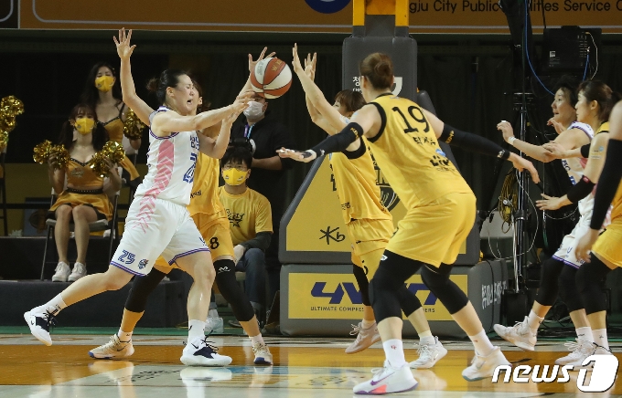 (청주=뉴스1) 김용빈 기자 = 13일 오후 충북 청주시 청주체육관에서 열린 KB국민은행 Liiv M 2020-2021 여자프로농구 청주 KB 스타즈와 용인 삼성생명 블루밍스의 챔피언 결정전 4차전에서 삼성 배혜윤이 패스를 하고 있다. 2021.3.13/뉴스1